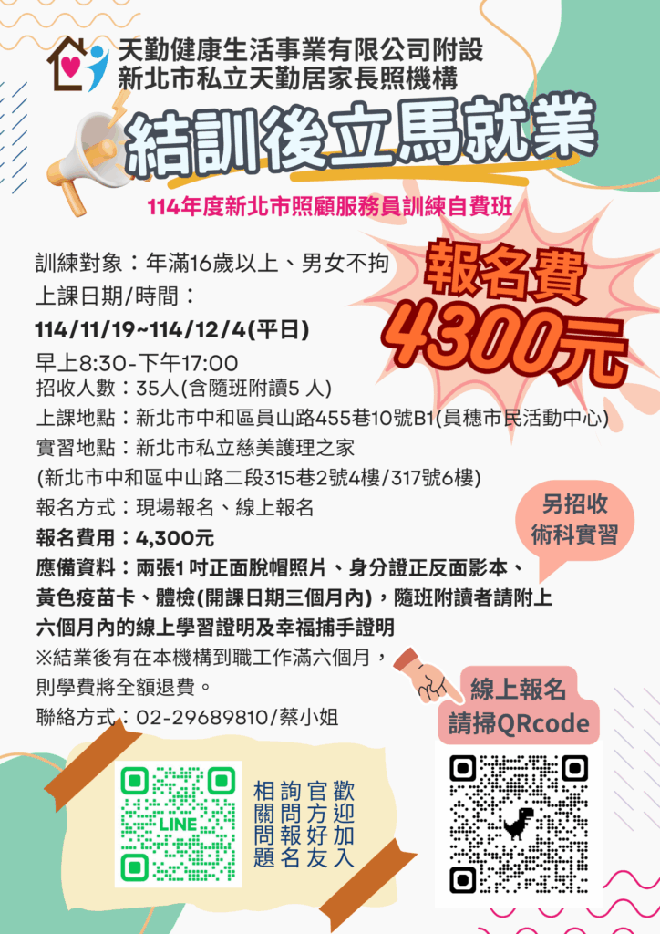 照服員訓練班招生中! 2025 年 10 月 9 日 / 新北天勤, 最新資訊 🌟【想轉職照服員?天勤幫你實現!】🌟想投入長照行列、培養一技之長、開啟穩定又有意義的職涯嗎?👩⚕️👨⚕️來參加 天勤居家機構 照顧服務員訓練班 就對啦! 📅 開課日期|114年11月19日(星期二)~114年12月4日(星期三)🕘 上課時間|平日白天,全程實體課程,理論+實作雙強組合!📍 上課地點|中和區員穗活動中心🧪 技術考核地點|慈美護理之家 💡 課程特色✔ 專業講師帶領,實戰經驗滿滿✔ 小班制教學,互動學習更有感✔ 結訓即可報考照服員技術士檢定✔ 成為居家照護專業人才的第一步! 🖥️ 線上報名連結|點此報名📍 傳統報名地點|新北市板橋區文化路一段189號7樓之1☎️ 報名專線|02-2968-9810 分機22 (蔡小姐) 🔥 名額有限,報名要快!讓我們一起用雙手與愛心,照亮每一位長輩的生活 ❤️ #照顧服務員訓練班 #新北天勤 #長照專業 #中和開課 #線上報名 #轉職好選擇